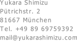 Die Inhalte der Website www.yukarashimizu.com sind urheberrechtlich geschützt. Die Vervielfältigung, Veränderung oder Verwendung dieser Website und ihrer Inhalte (z. B. Fotos, Texte) ist ohne ausdrückliche schriftliche Zustimmung von Yukara Shimizu nicht gestattet.